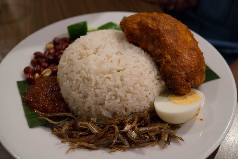 Coconut rice, sambal, peanuts, crispy little fish, cucumber, hard boiled egg, fried chicken